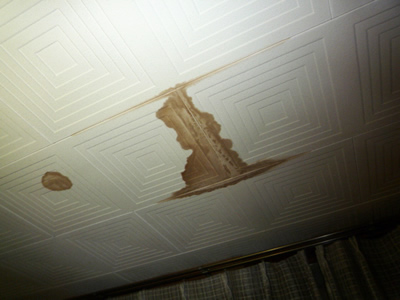 排泄した尿が積み重なれば、天井のシミに! ハクビシンの尿と糞で天井板が変色しシミになります。 |